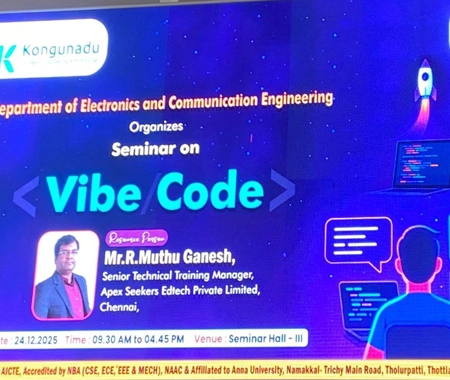 Kongunadu College of Engineering | 24-12-2025 Had a great experience conducting a one-day hands-on workshop for ECE students, focused on Generative AI and Vibe Coding platforms. The session was designed to ignite coding interest, especially among students who were initially afraid of coding. With the help of Vibe Coding tools, students were able to code with confidence, build applications easily, and experience the power of AI-assisted development. Seeing beginners successfully create applications was truly motivating. Grateful to the College Management and ECE HOD of Kongunadu College of Engineering and the Apex Seekers team for this wonderful opportunity and support. Looking forward to inspiring more students in their AI & coding journey